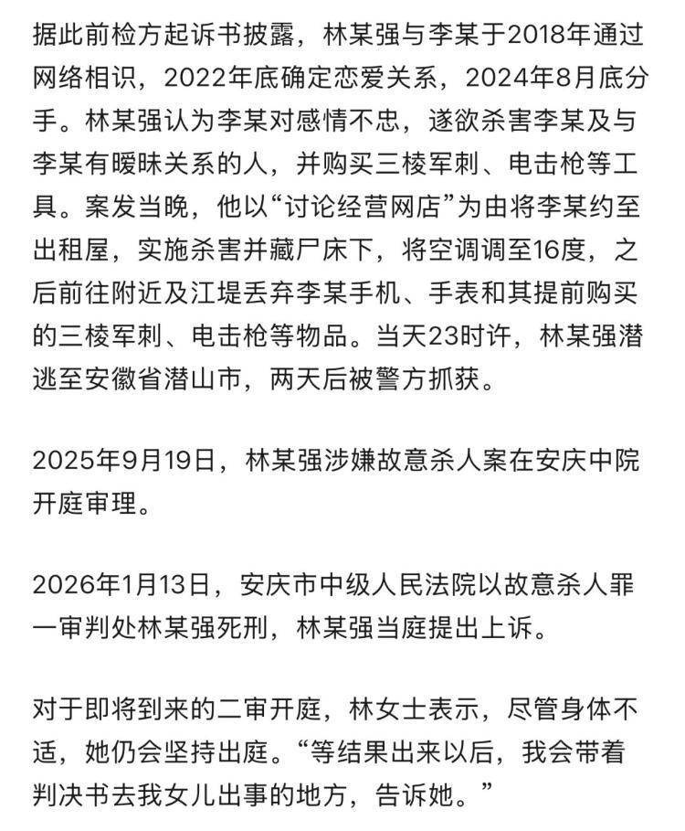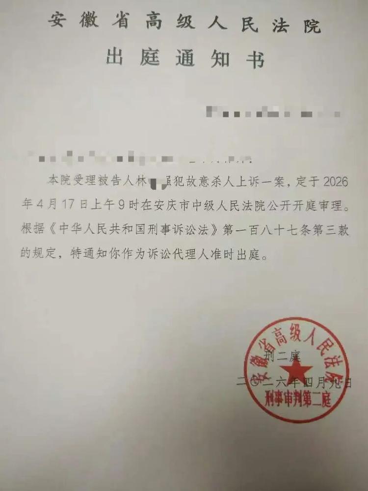 4月9日,记者从林女士处了解到,因被告人林某强上诉,该案将于4月17日上午9时在安庆中级人民法院公开审理。